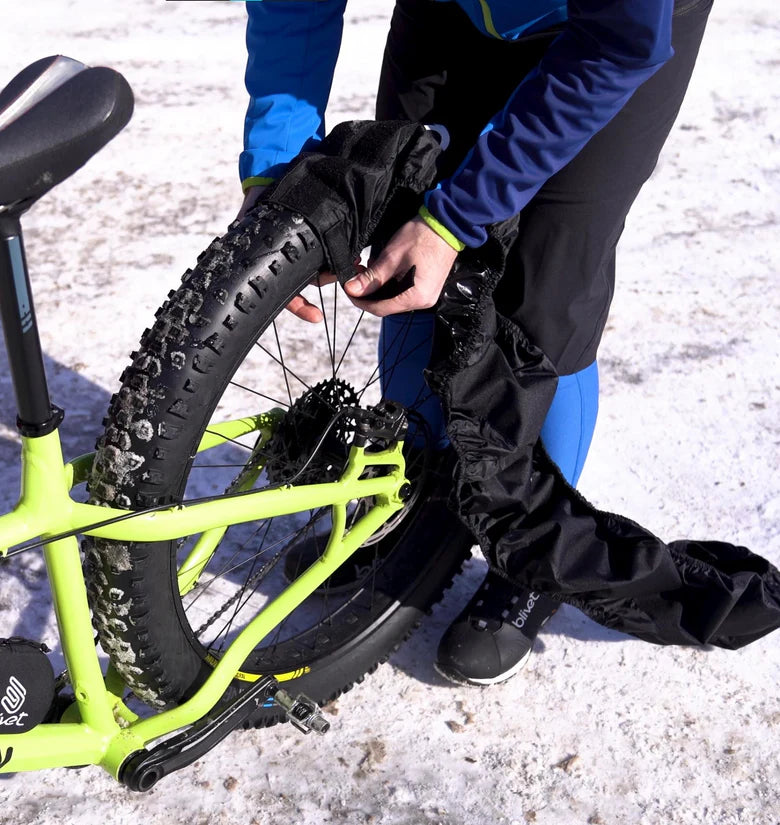 The centre of the TINDR tire cover which covers the studded portion of the tire is made of high-durability 600-denier polyester. The sides covering the side walls of the tire are made of highly flexible nylon with an elastic band to perfectly fit the shape of the tire. The wheels rotate without restriction, the bike rolls, no need to lift the bike to move it!